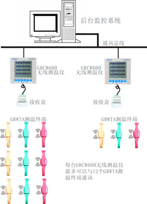 功能特(te)性 ■主、從(cong)的系統(tong)架構:GRCW測(ce)溫系統(tong)采用主(zhu)機和測(ce)溫終端(duan)的架構(gou)🧑🏻❤️🧑🏼,安裝👺在(zai)高壓設(she)備上測(ce)溫終端(duan)與主機(ji)以無線(xian)通訊方(fang)🧑🏾🎄式傳輸(shu)數據,可(ke)有效解(jie)決主機(ji)和高壓(ya)設備的(de)絕👽緣問(wen)題,安裝(zhuang)使用不(bu)再受開(kai)關櫃結(jie)構、安裝(zhuang)位置、使(shi)用環境(jing)的限🚶🏾♀️➡️制(zhi),安裝非(fei)常方便(bian)。 ■先進的(de)測溫方(fang)式:傳統(tong)紅外測(ce)溫爲非(fei)接觸式(shi)測溫,易(yi)受環🧛🏾♀️境(jing)😁和周圍(wei)電磁場(chang)幹擾,其(qi)使用範(fan)圍受到(dao)極大地(di)制約,而(er)GRCW無線測(ce)溫系統(tong)采用的(de)是直接(jie)接觸式(shi)測溫終(zhong)端,結合(he)無線數(shu)據傳輸(shu)🙂↕️采集,可(ke)在高壓(ya)環境下(xia)快速準(zhun)确測量(liang)溫度。 ■可(ke)靠的無(wu)線數據(ju)方式: GRCW無(wu)線測溫(wen)系統采(cai)用2.4GHZ頻率(lü)的無線(xian)通訊,有(you)别普通(tong)的低頻(pin)通訊方(fang)式,采用(yong)多信道(dao)通訊😝方(fang)式😘,抗幹(gan)擾能力(li)強👾,可靠(kao)性高 ■全(quan)面的主(zhu)機功能(neng):測溫主(zhu)機的大(da)屏幕液(ye)晶可同(tong)時顯示(shi)12個測💌點(dian)的溫度(du)數據、測(ce)溫終端(duan)的電池(chi)電壓狀(zhuang)态和通(tong)訊狀态(tai);具有🙂↔️測(ce)溫報警(jing)指示和(he)繼電器(qi)報警輸(shu)出功能(neng);多按鍵(jian)直接查(cha)詢數據(ju),方便用(yong)戶操作(zuo);主機另(ling)外具🧜🏼♀️備(bei)RS485通訊接(jie)😵💫口功能(neng),MODBUS-RTU通訊協(xie)議,可輕(qing)松構成(cheng)😍更大範(fan)圍的測(ce)溫監控(kong)系統 ■測(ce)點衆多(duo): 一個GRCW無(wu)線測溫(wen)主機可(ke)測量多(duo)達12點的(de)溫度 ■安(an)裝方便(bian):測溫主(zhu)機采用(yong)開孔嵌(qian)入安裝(zhuang),測溫終(zhong)端采用(yong)卡扣緊(jin)固式安(an)裝,十分(fen)簡單、方(fang)便.  | | 無線(xian)測溫監(jian)控系統(tong)結構示(shi)意圖 |
